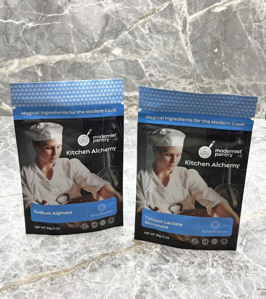 I’m not going to candy-coat it, this cocktail is a doozy to make. First, you’re going to need to get Sodium Alginate and Calcium Lactate Gluconate, either an ice cube tray or half-sphere molds, and a spoon with holes in it.