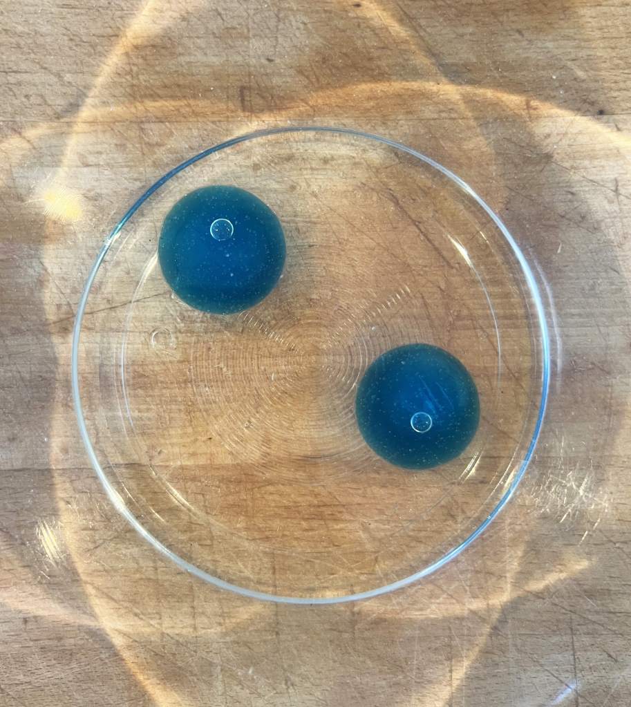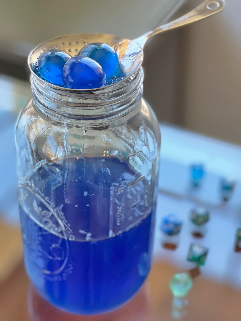- 75g (2 ½ oz) Gin (Modernist Pantry calls for Empress, which I love, but I wanted these to be blue so I used Hendricks and a couple drops of blue food coloring)